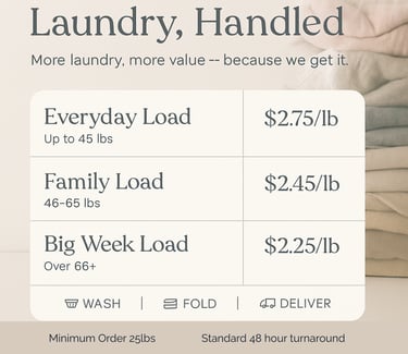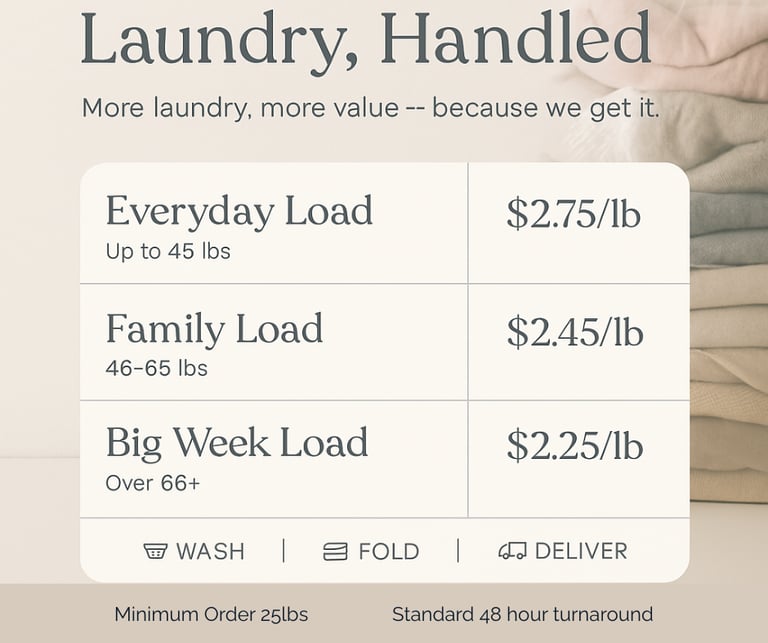 Our tiered pricing gives bigger families and busier households built-in value, without cutting corners on care. Every order is still washed separately, folded beautifully, and delivered with premium detergents — always included, never extra.